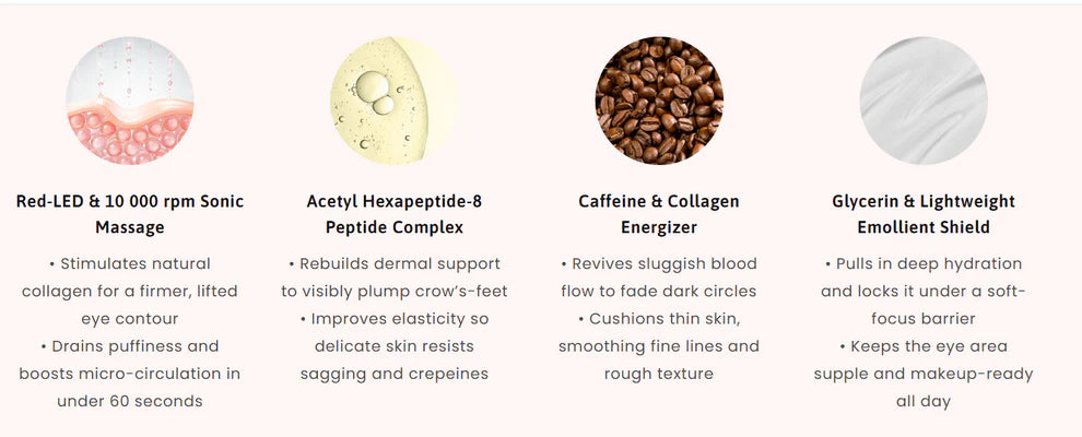 Powered by Acetyl Hexapeptide-8 Peptide Complex, this advanced cream helps rebuild skin support, reduce fine lines, and visibly plump sagging skin. The Caffeine & Collagen Energizer boosts blood flow, fades dark spots, and softens rough texture, while Glycerin & Lightweight Emollient Shield lock in hydration for lasting smoothness.